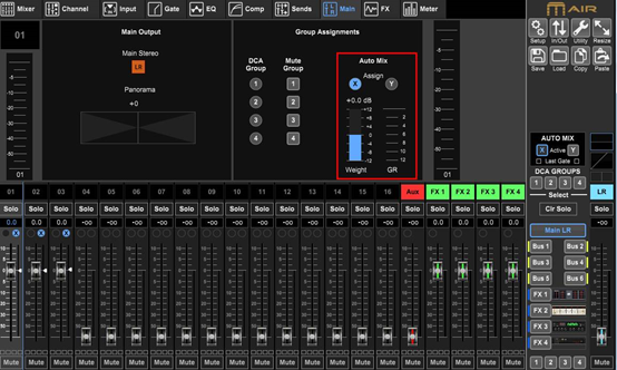 這裏的AUTO MIX可分為兩組,分別為X和Y,還有一個AUTO Weight(自動優先級的量)可進行調整,還有一個GR電平表可觀察到每個通道分享增益量的大小。
