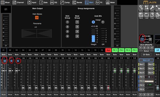 下麵我給前三個通道編到X組,這裏要注意的是,在給每個通道分完組之後,要記得把總的AUTO MIX的開關打開,如圖紅圈所示。